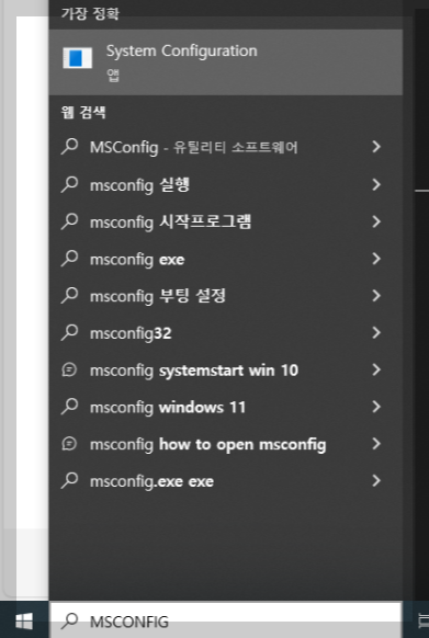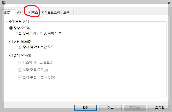 그림과 같이 검색란에 msconfig를 입력하고 엔터를 누릅니다. 그럼 시스템구성 창이 열립니다. 여기서 서비스로 이동을 합니다.