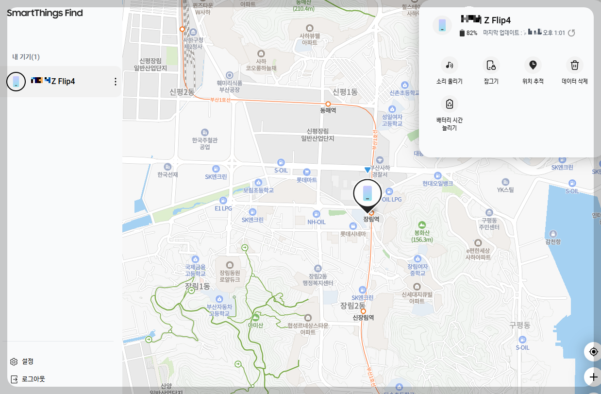로그인을 하면 자신의 스마트폰 위치가 자동으로 추적이 됩니다. 터치 스크린 눌러 확대하면 거의 정확한 위치가 나옵니다 자신의 현재 배터리 상태를 확인할 수 있고 휴대폰 위치 추적 기능뿐만 아니라 여러 가기 기능을 제공하고 있는데요.