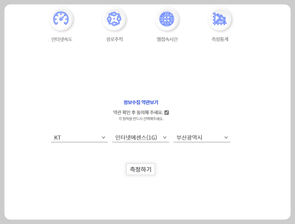 사이트에 접속하셔서 인터넷속도 아이콘을 눌려 속도 측정 프로그램을 설치하시고 속도를 측정하시면 됩니다. 통신사와 가입된 속도가 100 Mbps 상품의 경우 50 Mbps 이상, 500 Mbps 상품의 경우 250 Mbps 이상, 1 Gbps 상품의 경우 500 Mbps 이상 속도가 나와야 정상입니다.
