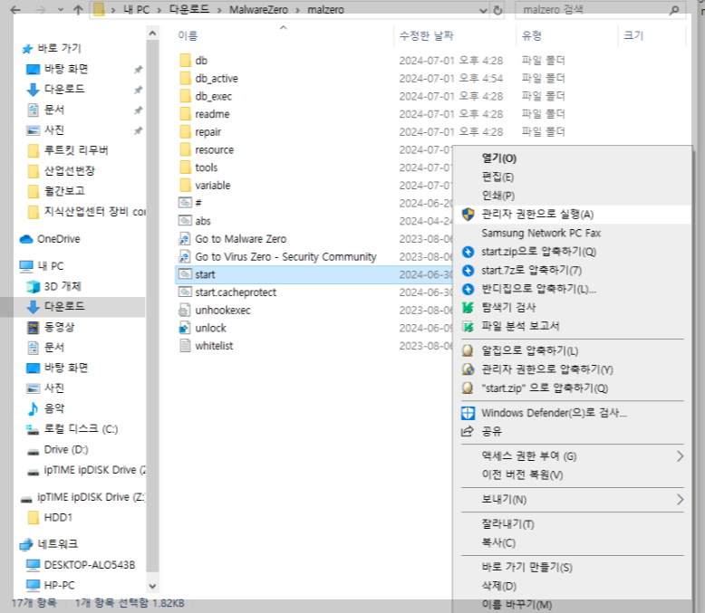 이제 압축을 푼 폴더에서 MalwareZero 폴더를 클릭하고 들어가면 start 파일이 보입니다. start 파일에 오른쪽 마우스를 클릭하셔서 관리자 권한으로 실행해 주세요.