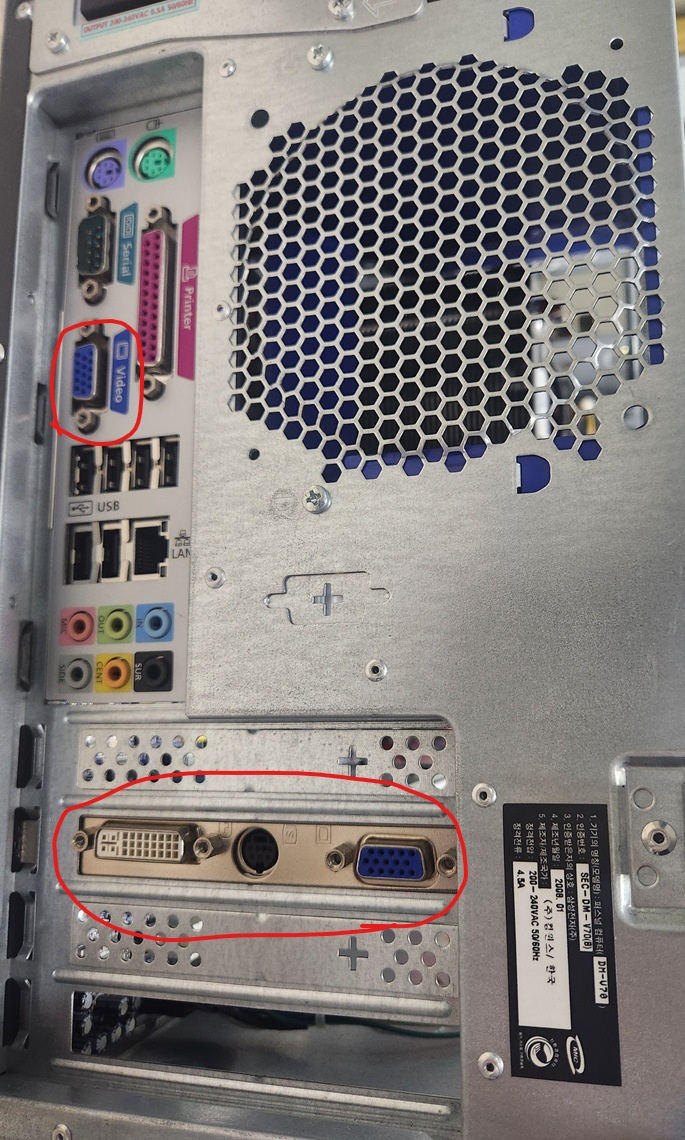 모니터 케이블을 컴퓨터에 잘못 연결하는 경우 화면이 안 나오는 경우가 흔하게 발생하는데요. 컴퓨터 본체 뒤에 보시면 사진과 같이 모니터 케이블 연결 단자가 2개가 있는 경우 위에 위쪽 단자에 모니터 케이블을 연결하면 화면이 안 나옵니다. 반드시 아래 단자에 모니터 케이블을 연결해야 됩니다.