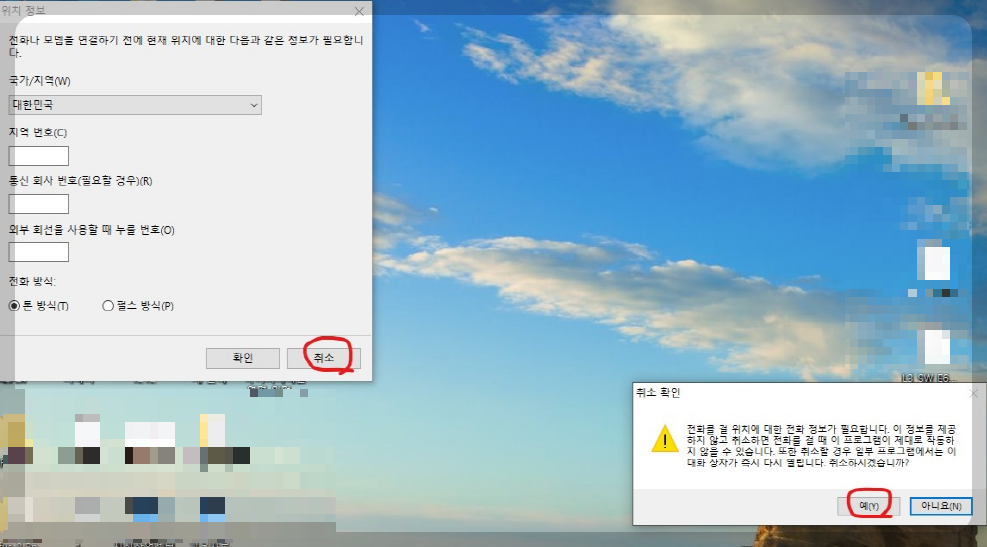위치 정보 창이 보이면 취소를 눌러줍니다. 취소 확인 창에는 예를 눌러줍니다.