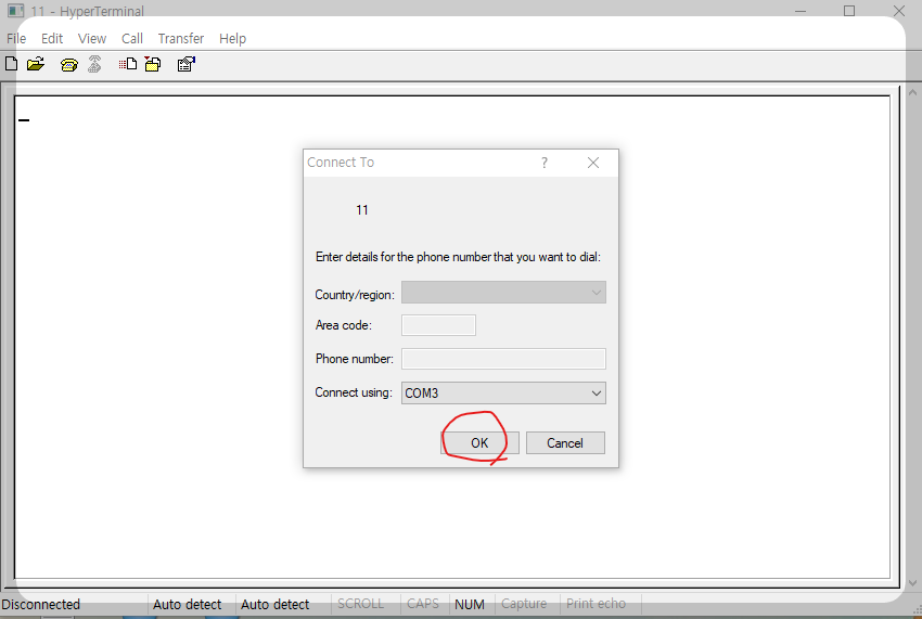 포트를 확인했으면 다시 하이퍼터미널 창으로 돌아와서 Connect using에 자신의 USB 시리얼 포트를 선택하면 됩니다 저의 경우는 COM3으로 연결되어 있어서 COM3을 선택했습니다.