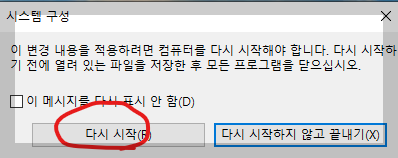 다시 시작을 눌러주세요. 컴퓨터가 재시작되면서 빨라집니다. 혹시 컴퓨터가 재시작되었을 때 안 되는 실행이 안 되는 프로그램이 있거나 문제 가 발생한다면 모든 microsoft 서비스 숨기기를 누르고 스크롤을 내려서 문제가 있는 프로그램을 찾아서 체크해 주고 적용 확인을 눌러주면 됩니다.