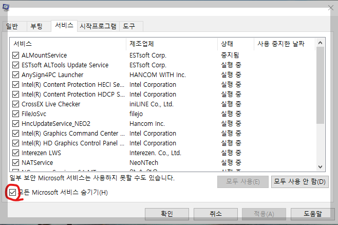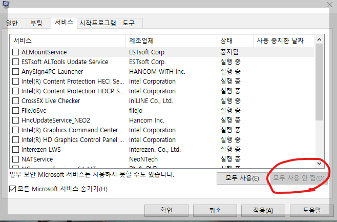 모두 사용 안 함을 눌러주세요. 그리고 적용을 누르고 그다음 확인을 누르면 됩니다.