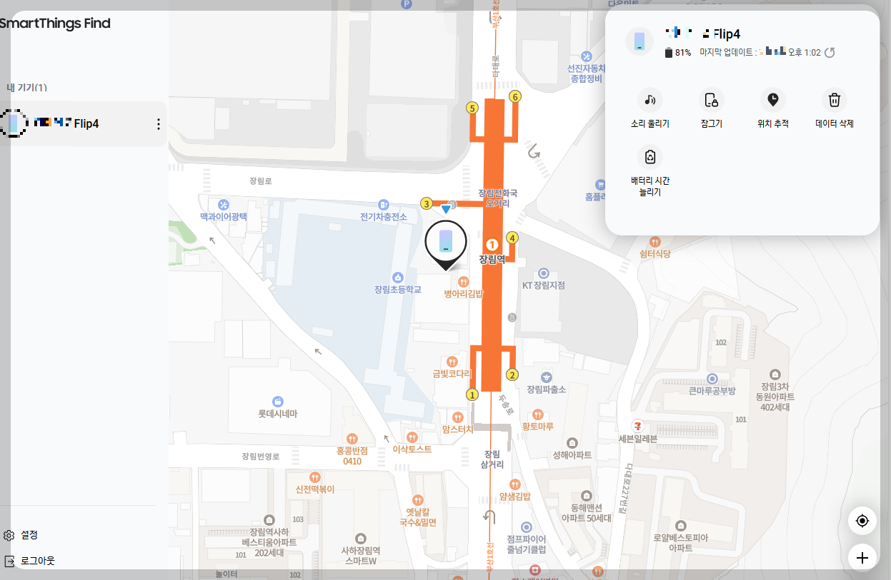 로그인을 하면 자신의 스마트폰 위치가 자동으로 추적이 됩니다. 터치 스크린 눌러 확대하면 거의 정확한 위치가 나옵니다 자신의 현재 배터리 상태를 확인할 수 있고 휴대폰 위치 추적 기능뿐만 아니라 여러 가기 기능을 제공하고 있는데요.