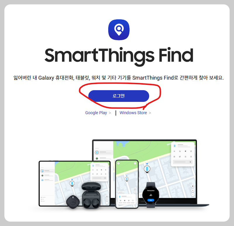 삼성 스마트폰의 경우 삼성 smart thins find에서 내 스마트폰의 위치를 추적할 수 있습니다. 아래의 링크를 통해 smart things find 홈페이지에 접속을 합니다.