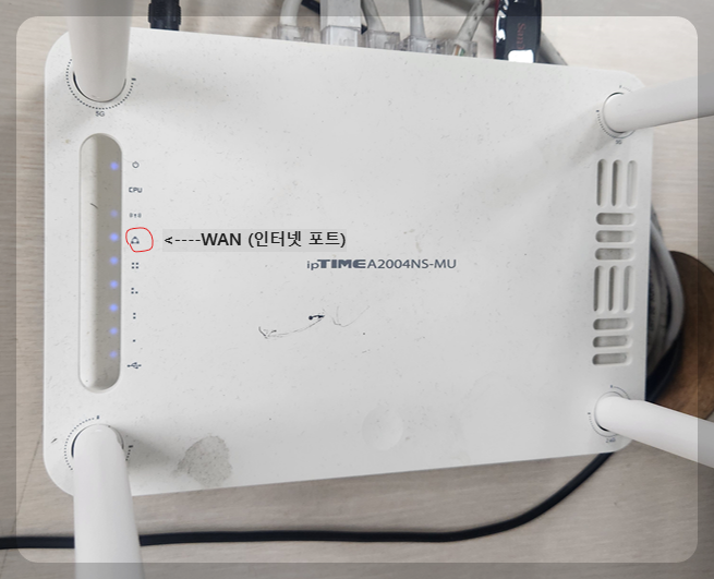공유기 WAN포트 램프를 확인해 보시면 됩니다. WAN 포트 램프는 아이피타임의 경우 삼각형 모양의 아이콘으로 되어 있는데요 다른 공유기는 WAN으로 적혀 있거나 지구 모양의 아이콘으로 되어 있습니다.