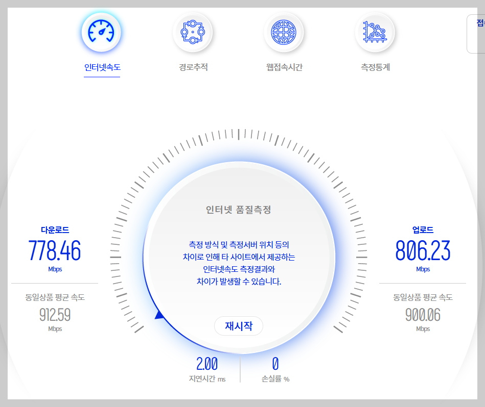 사이트에 접속하셔서 인터넷속도 아이콘을 눌려 속도 측정 프로그램을 설치하시고 속도를 측정하시면 됩니다. 통신사와 가입된 속도가 100 Mbps 상품의 경우 50 Mbps 이상, 500 Mbps 상품의 경우 250 Mbps 이상, 1 Gbps 상품의 경우 500 Mbps 이상 속도가 나와야 정상입니다.