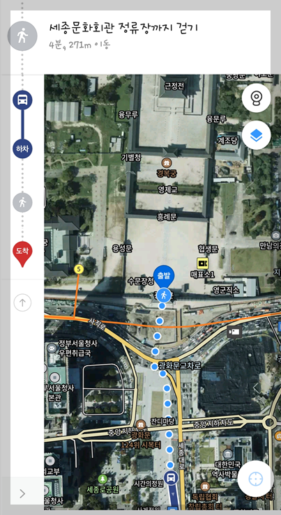 아래의 화면에서 세종문화회관 정류장까지 걷기를 누르시면 오른쪽 아래 사진과 같이 지도 화면의 나의 위치가 표시되고 파란색 점선으로 버스 정류소 위치를 알려줍니다.