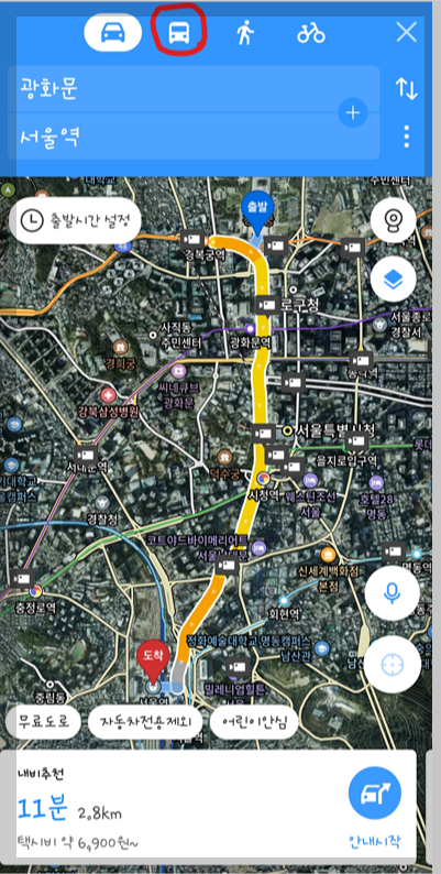 그다음 이용수단을 선택하시면 되는데요. 상단에 표시된 아이콘을 선택하시면 됩니다. 지하철이나 버스와 같은 대중교통을 이용하셔서 이동을 하시려면 버스 모양의 아이콘을 누르시면 됩니다.