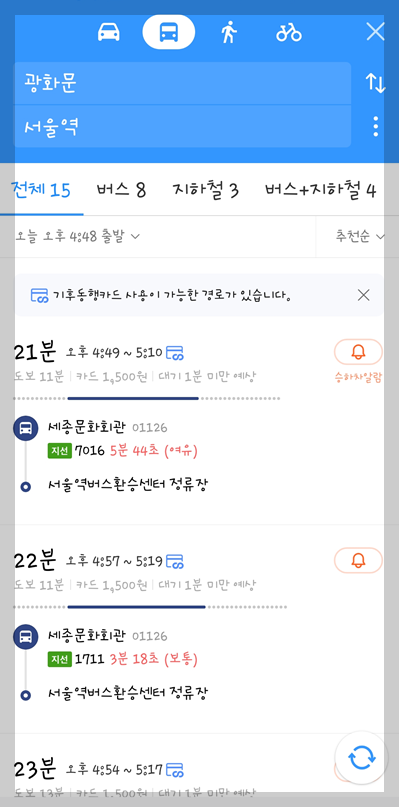 버스 아이콘을 선택하면 아래의 3번째 사진과 같이 여러 개의 경로 목록이 추천순으로 표시가 됩니다. 경로 목록에는 이동하는 데 걸리는 시간, 버스 번호 및 버스 도착 시간을 확수 있습니다.