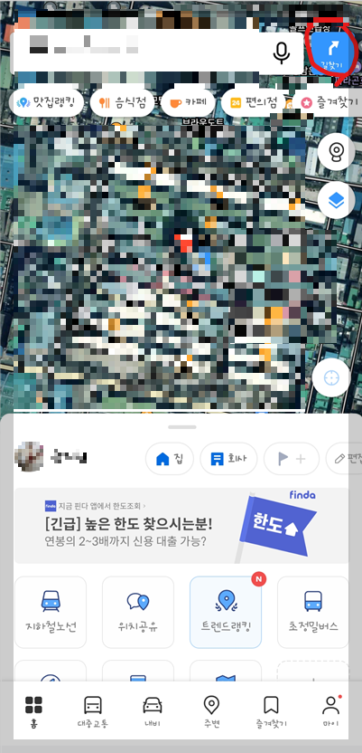 카카오 맵 어플을 다운로드하여 실행을 하면 아래와 같은 화면이 나옵니다. 길 찾기 버튼을 눌러주세요.